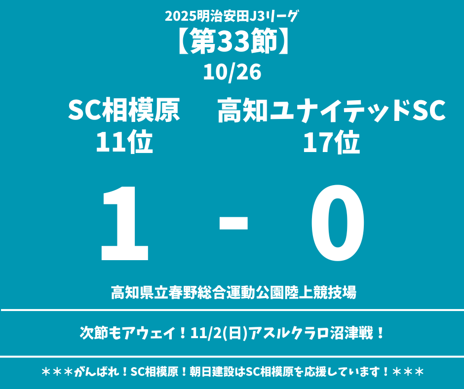 ☆2025 J3リーグ第33節 SC相模原(11位)1-0高知ユナイテッドSC(17位)