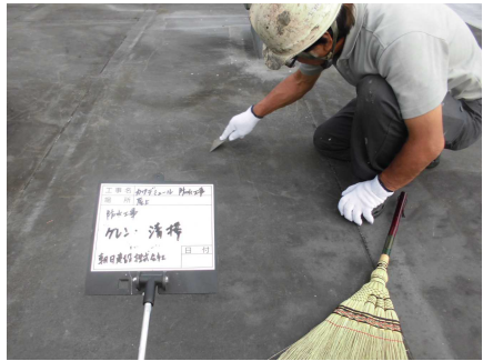 シートの上からウレタン防水を塗布。下塗り、上塗りと2回行いました。
