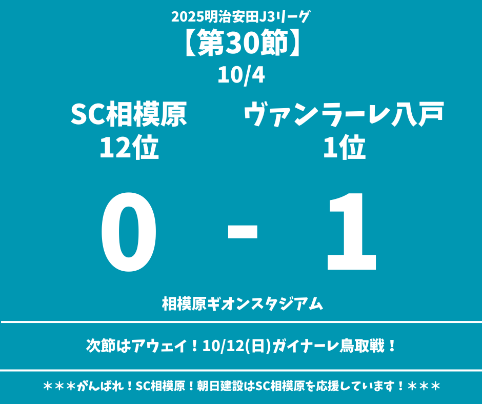 ☆2025 J3リーグ第30節 SC相模原(12位)0-1ヴァンラーレ八戸(1位)