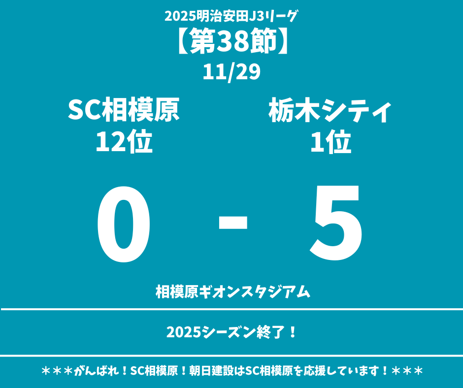 ☆2025 J3リーグ第38節 SC相模原(12位)0-5栃木シティ(1位)