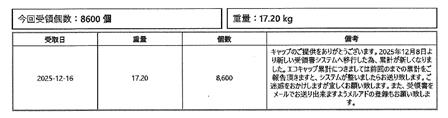 いただいた受領書には“累計のキャップをゴミとして焼却した場合のCO2の発生量”