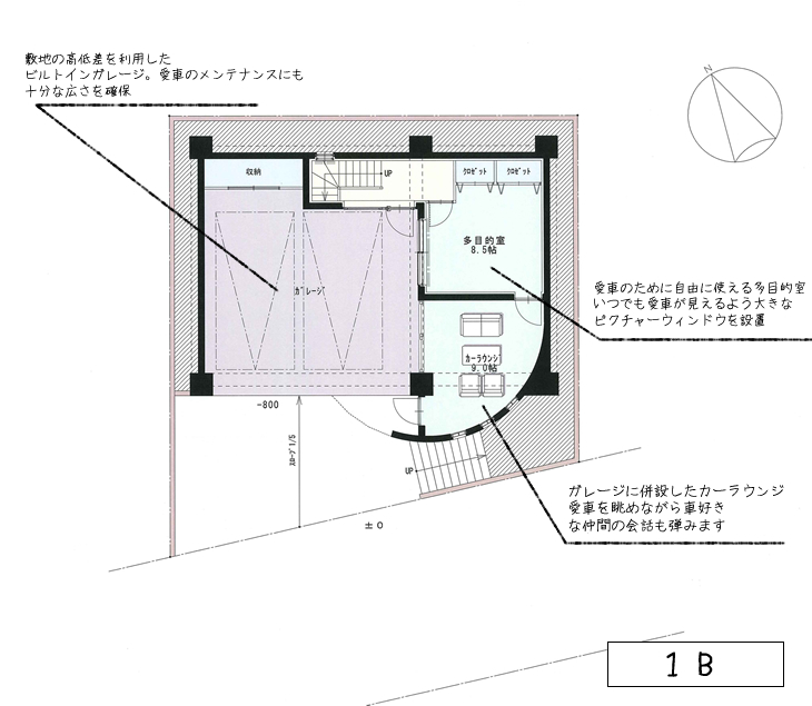 ①敷地の高低差を利用したビルトインガレージ。愛車のメンテナンスにも十分な広さを確保。